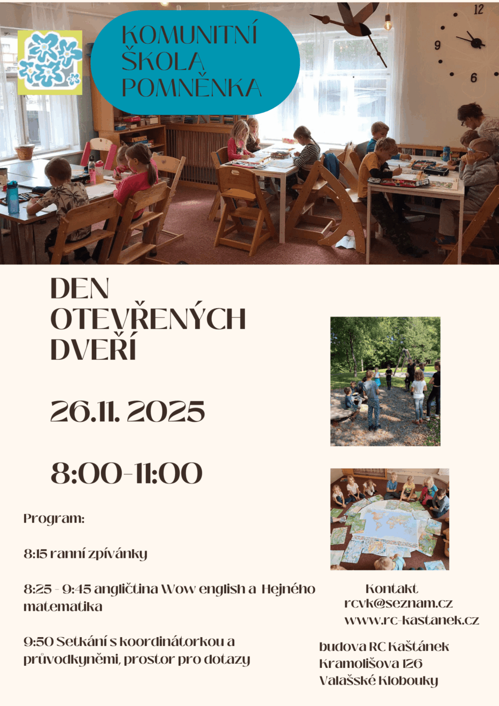 Den otevřených dveří v Pomněnce autor: RC Kaštánek | Lis 1, 2025 | Aktuality Kaštánek, Aktuality Pomněnka 26. listopadu (10 – 11) Vás srdečně zveme na DEN OTEVŘENÝCH DVEŘÍ v Pomněnce Přijďte se podívat a poptat, jak to v naší škole chodí 🙂
